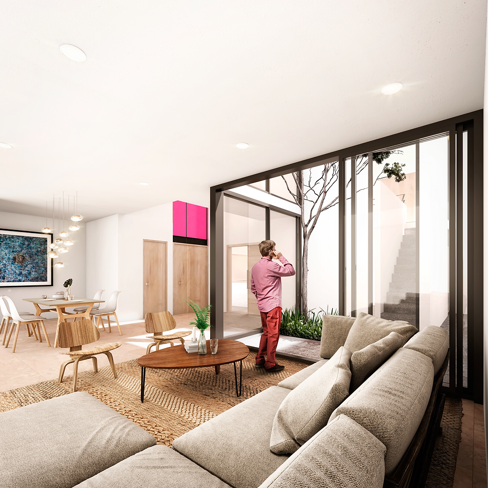El acceso principal se resuelve con una escalinata exterior lateral flanqueada por la característica composición natural del terreno hasta la parte central de la casa, una puerta que abre paso al hall de doble altura, remata de frente con un pequeño patio que sirve de lucernario para toda la casa y es atravesado en el segundo nivel por un puente que desemboca en la recamara principal.