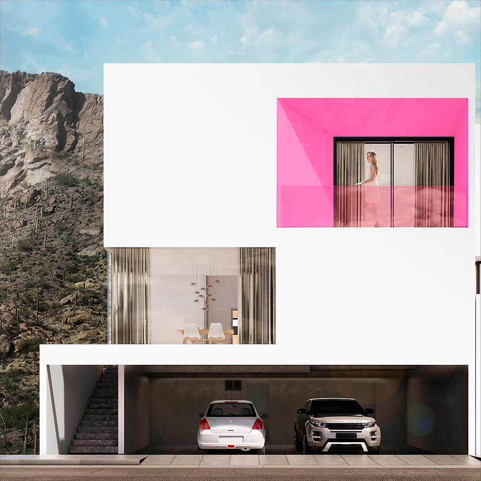 Una geometría solida que mantiene las proporciones de la volumetría en la fachada, en la cual, resalta un detalle en color y planos inclinados que rompe con la sobriedad de las formas ortogonales.