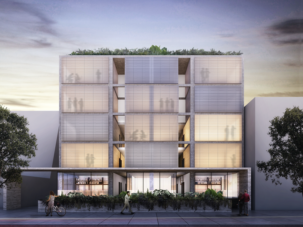 Un pequeño edificio de 4 pisos pragmático y funcional de plantas modulares que propone una expresión muy clara y sobria sobre sus fachadas. Una geometría coherente con lo que sucede en su interior. Un marco de concreto que vuela sobre la fachada en primer nivel, participa con el exterior dándole una escala urbana y a su vez, define las áreas destinadas al comercio.