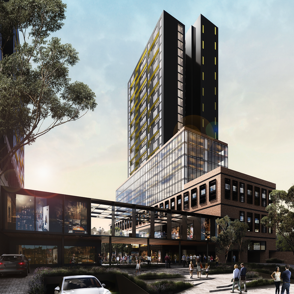 El conjunto se propone en función de un parque central que da vida al área comercial en dos niveles. A un costado se erigen un par de edificios de vivienda de 17 niveles y en el otro un edificio de oficinas de 22 pisos, usos que funcionan de manera independiente pero que convergen en un pulmón representado por las áreas verdes de del parque central. Desde la avenida principal se puede descubrir dichas áreas verdes y área comercial por la profundidad que provoca un volumen de cristal y estructura metálica que a manera de puente conecta los volúmenes laterales. El carácter que le da al conjunto los materiales propuestos como el ladrillo, acero y cristal hacen alusión a la historia de la industria que caracterizó a la zona y que busca permanencia en la memoria colectiva.